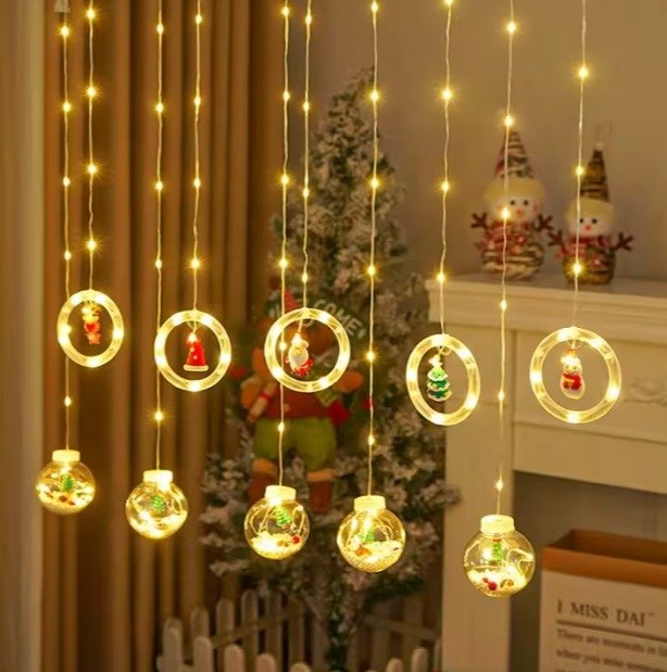 LED коледна завеса, прозрачни коледни топки с фигурки и снежинки